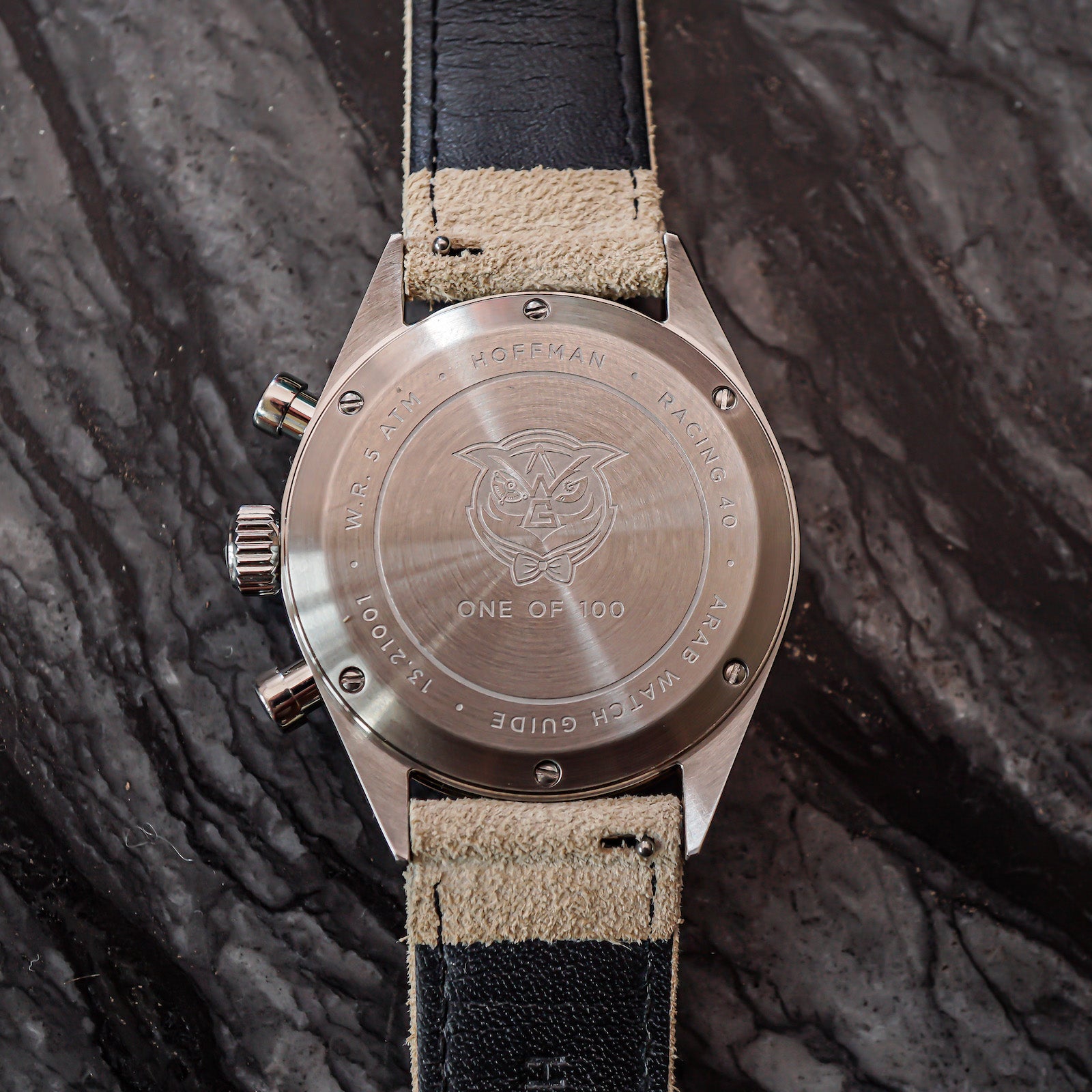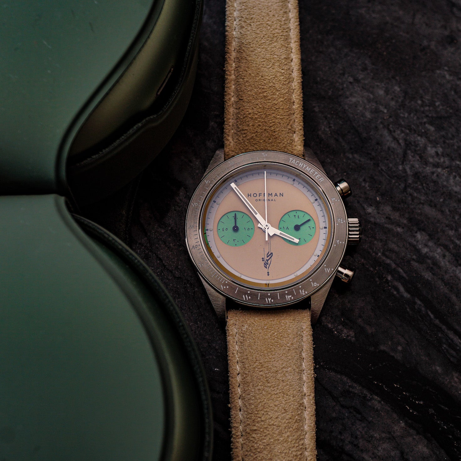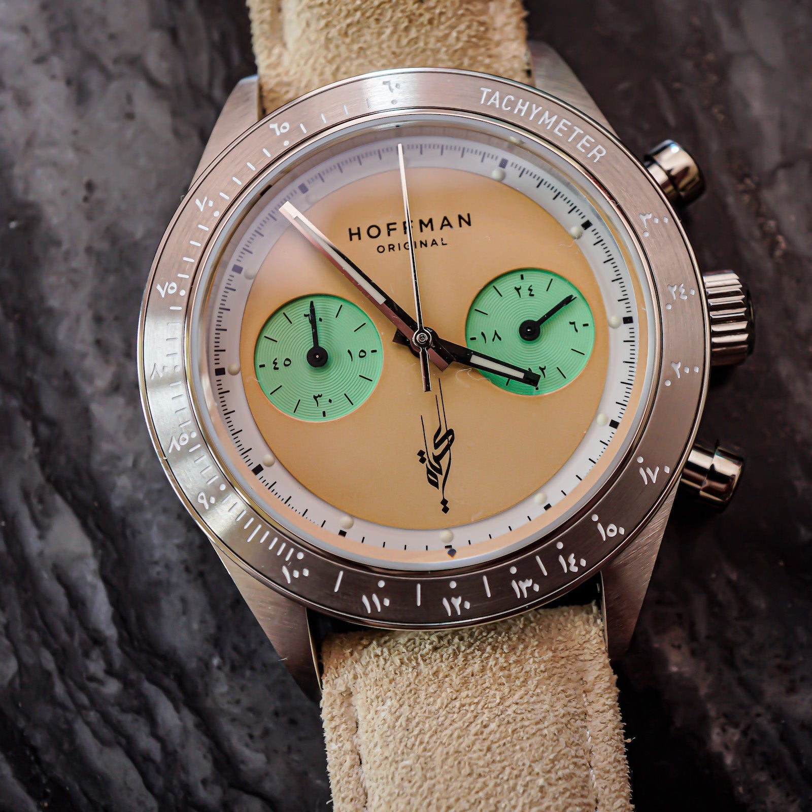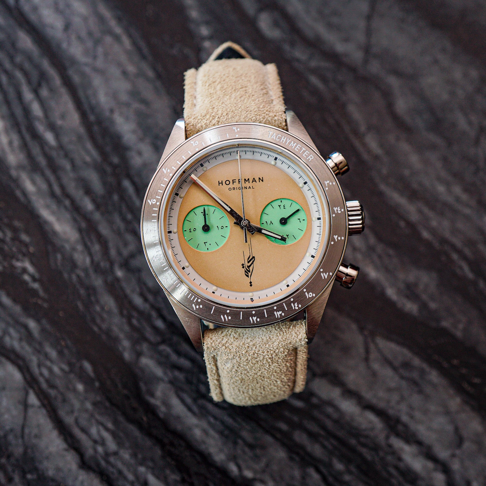 The dial on the Hoffman racing is dual-layered with a new Minty sub Chronograph dials, and a Sandy unique main dial.