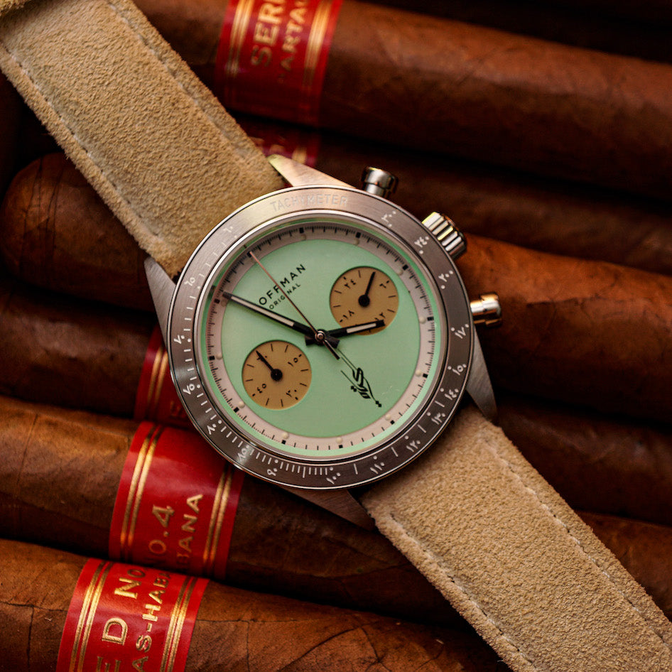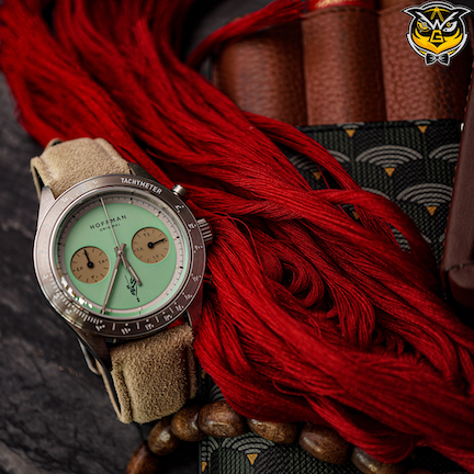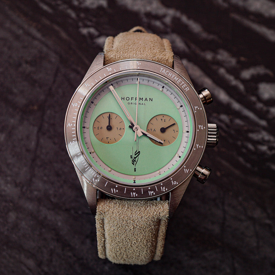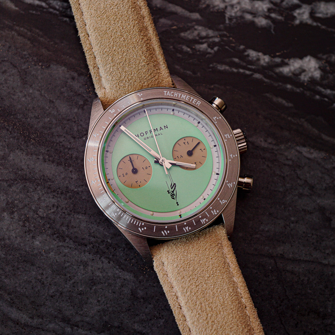 The dial on the Hoffman racing is dual-layered with a new Minty dial, and a Sandy Sub dials unique main dial.