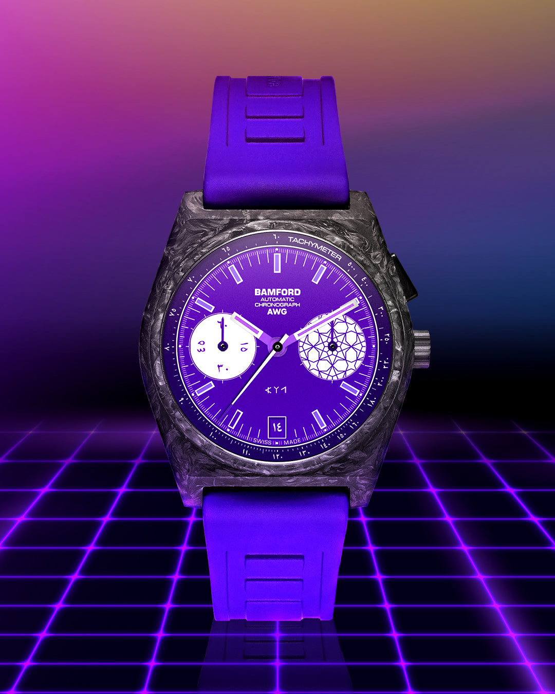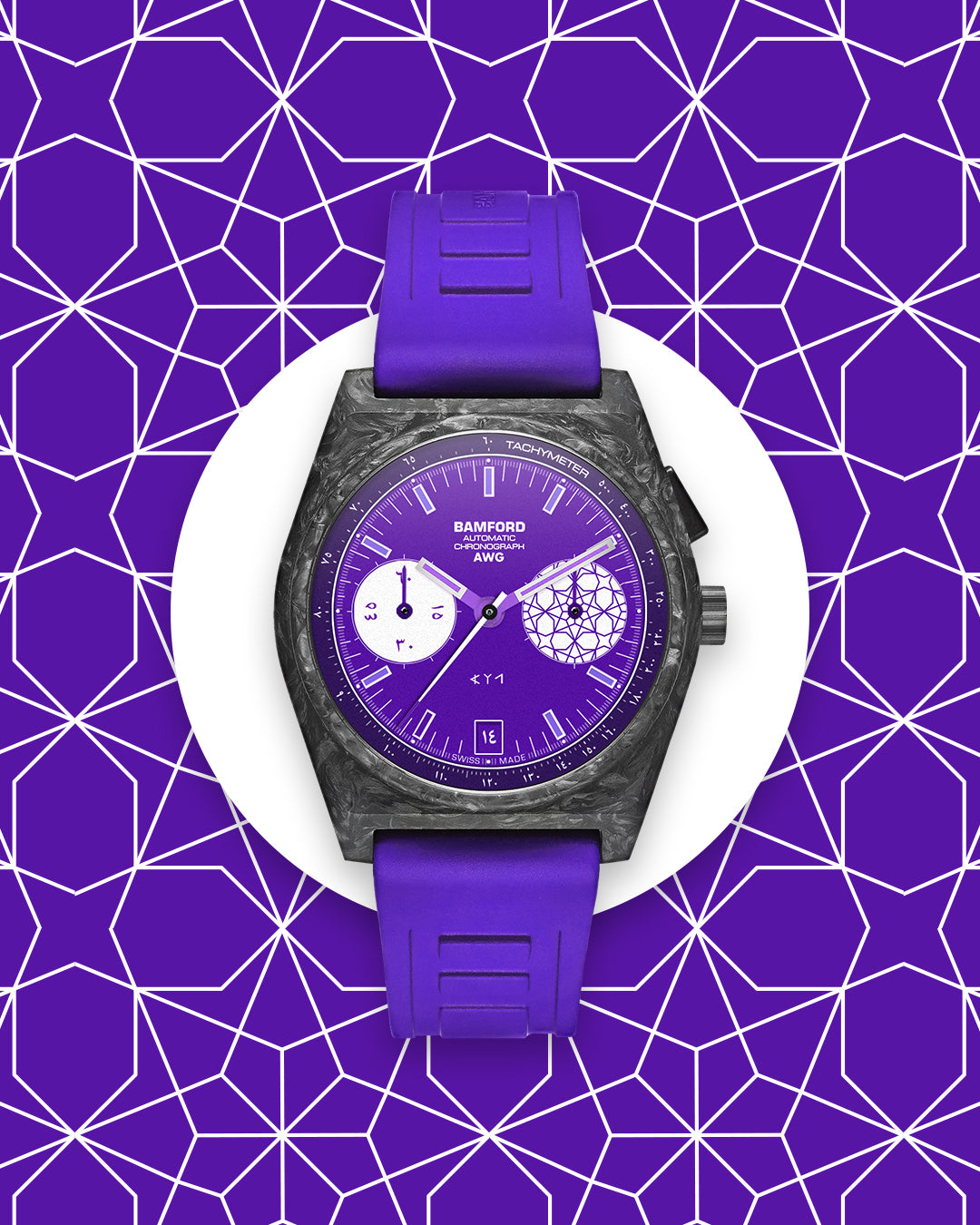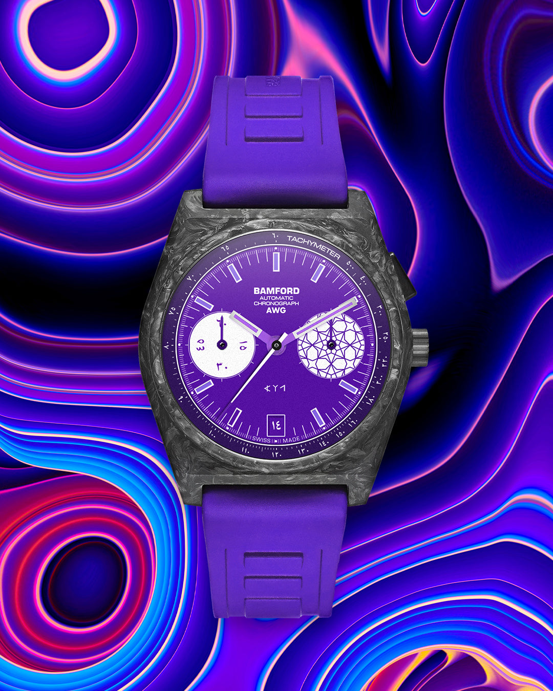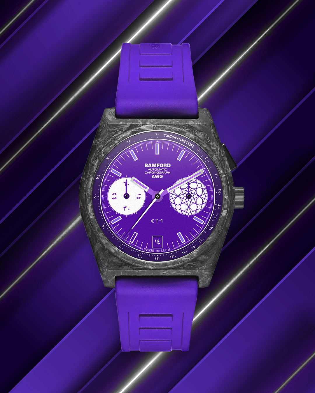 The Swiss-made Bamford B347 – Bamford AWG is an automatic monopusher chronograph. Vibrant Purple and black colourways with a 41.5mm black forged carbon fibre case.