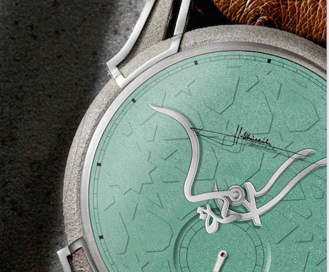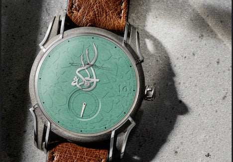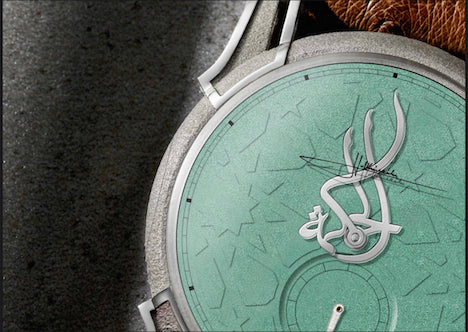 The supporting role of the dial background can not be underestimated. The green oxidized titanium colour scheme that is formed on a subtle relief based on the mashrabiya pattern offers a two dimensional pattern that provides an additional light play and charm. The frosted finish on the dial surface brings a sense of romance and refinement to the overall aesthetic.