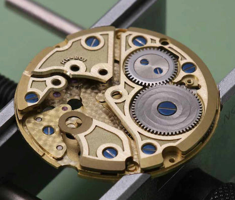 Movement: Holthinrichs signature gear bridge design with embossed edges, handmade anglage and snailing on the ratchet wheel.Embossed mashrabia inspired pattern between the embossed edges. Finished with 14k gold plating.