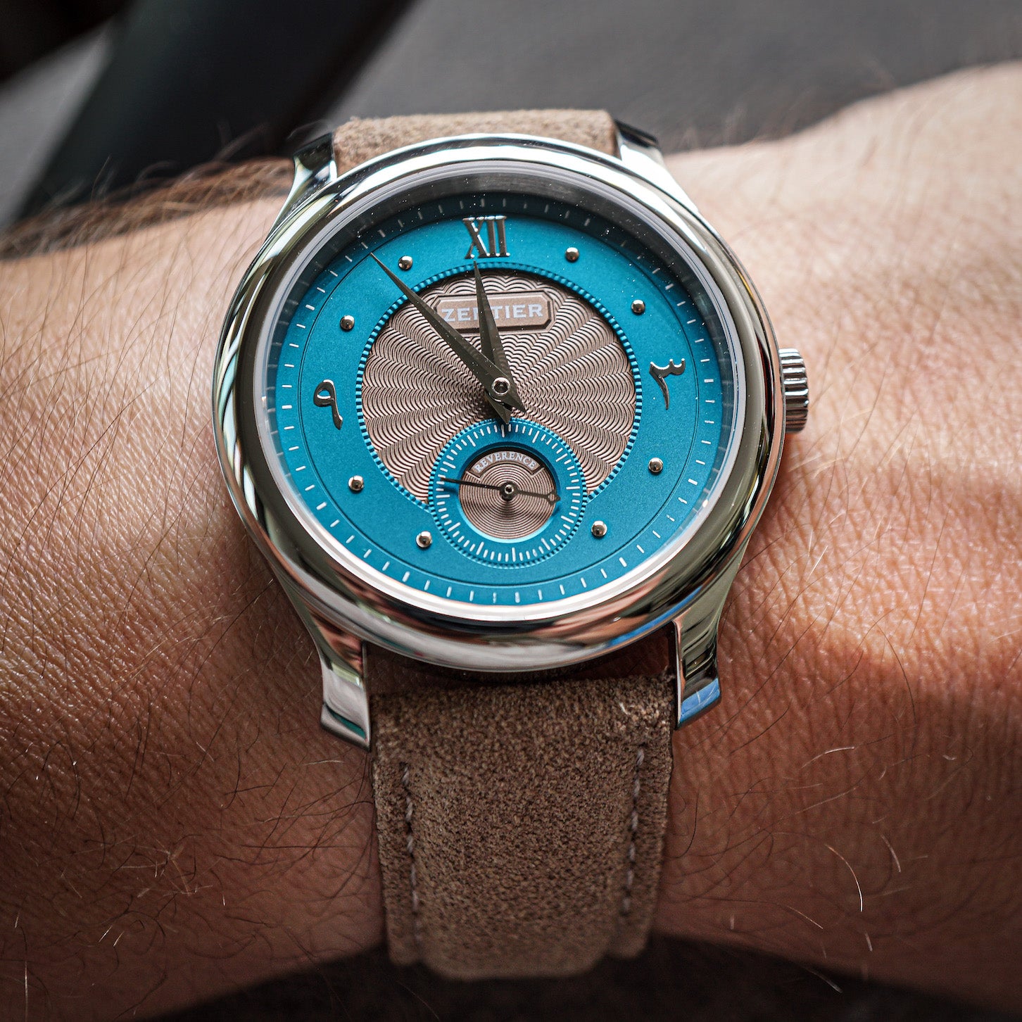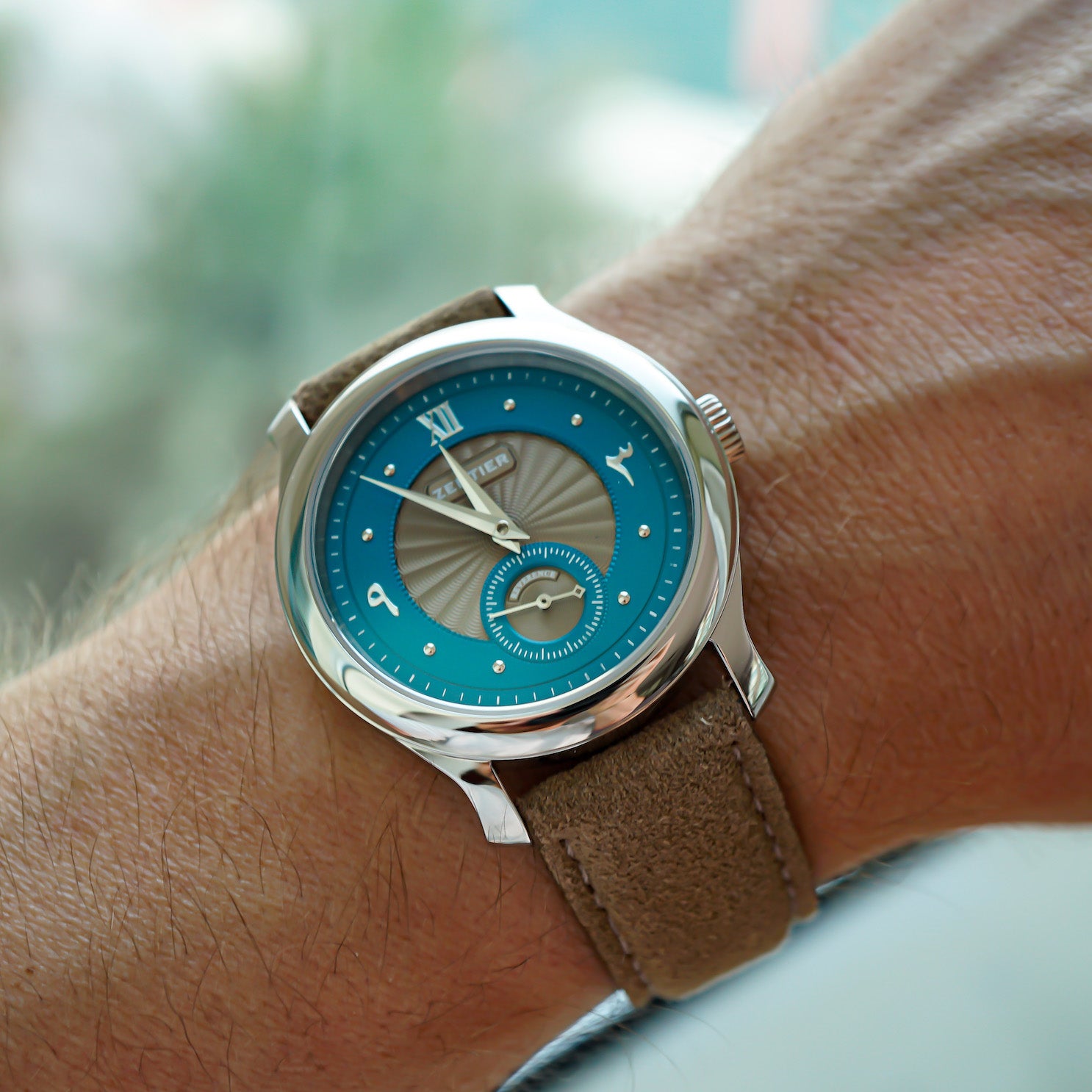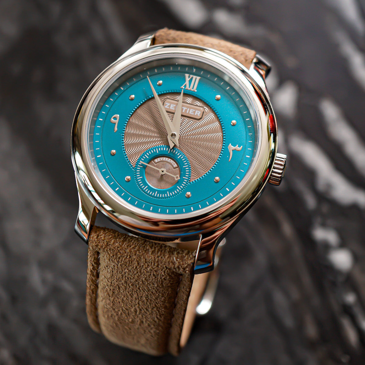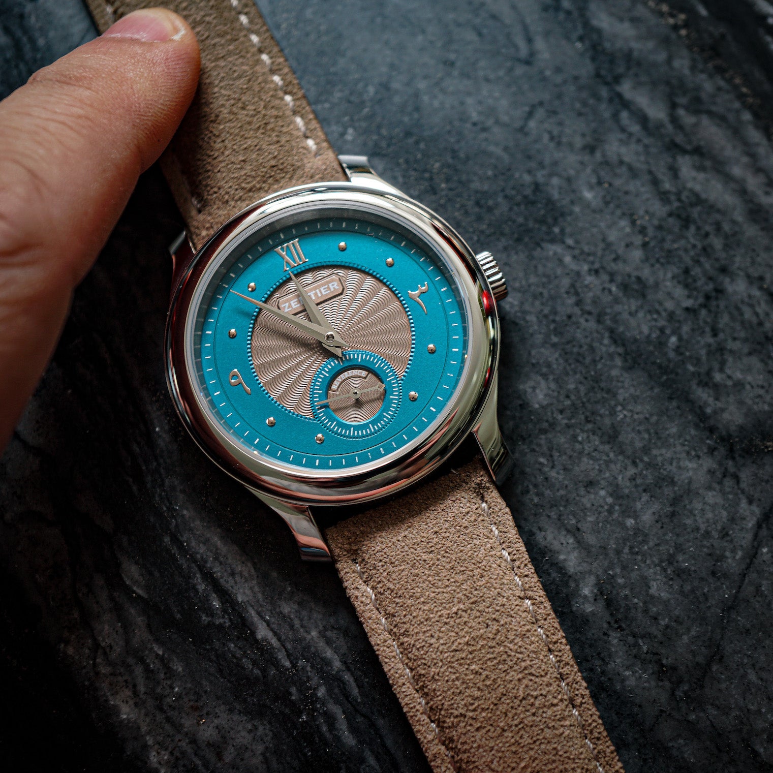 The dial colors inspirations come from the Middle East Region's landscape and terrain - a very unique Petroleum blue main dial with a central dial in desert beige guillochee.